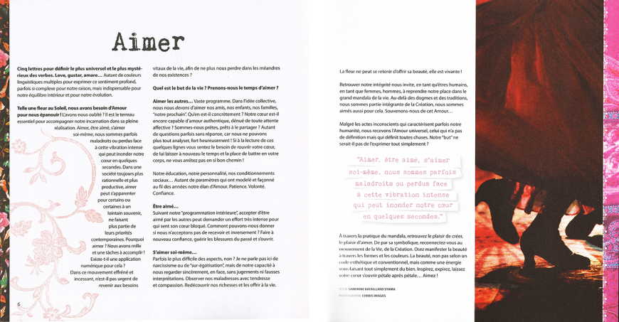 A travers la pratique du mandala, retrouvez le plaisir de créer, le plaisir d’aimer. De part sa symbolique, reconnectez-vous au mouvement de la Vie, de la Création. Osez manifester la beauté à travers les formes et les couleurs. La beauté, non pas selon un code esthétique et conventionné, mais comme une énergie vous faisant tout simplement du bien. Inspirez, expirez, laissez votre cœur s’ouvrir pétals après pétals… Aimer.