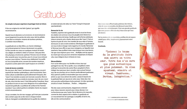 La gratitude est un état d’être, un chemin initiatique où le discernement et l’amour deviennent nos guides. Ce flux inonde nos cœurs en quelques instants et toutes nos cellules se mettent à vibrer à l’unisson. Cela peut être très physique, émotionnel, spirituel. Prenons-nous le temps d’en ressentir pour nos proches, la vie qui nous entoure ou nous-même ? Savons-nous réellement l’accueillir en nous lorsqu’elle arrive, souvent de manière imprévue afin de prendre à contre-pied notre mental toujours en contrôle ?